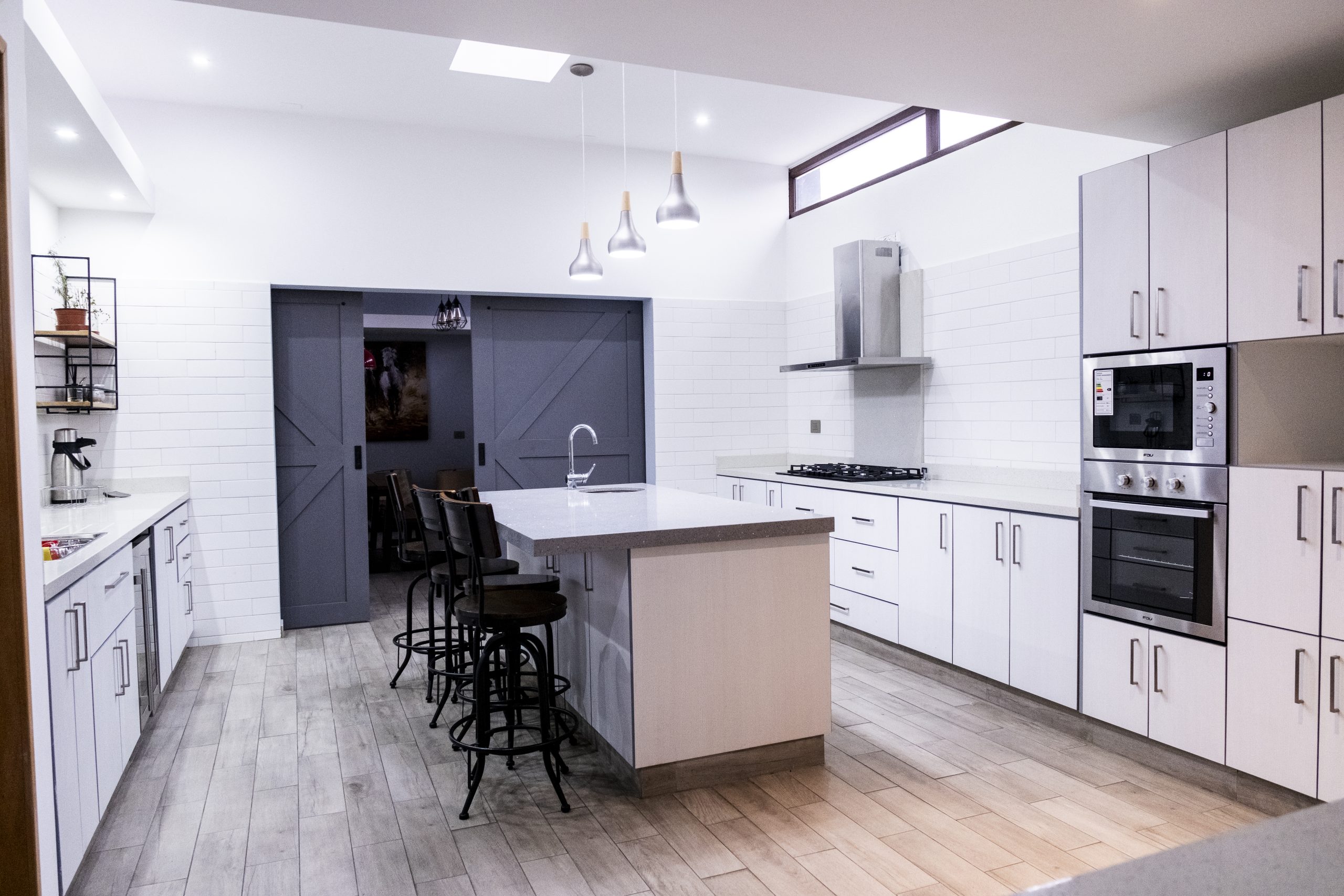 La cocina está amoblada y equipada con horno empotrado, encimera, campana, microondas, lavaplatos y una isla con cubierta de granito que aporta amplitud y funcionalidad. Asimismo, cuenta con una despensa de gran tamaño. El living y comedor son independientes y reciben excelente iluminación natural.